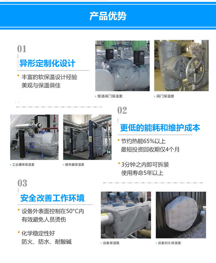 工業(yè)罐體保溫套無需專業(yè)保溫人員,無需專業(yè)培訓(xùn),操作簡單快速,表層纖維布不含石棉成分,防油、防水性能優(yōu)良,無纖維飛散問題,環(huán)保、安全、衛(wèi)生。隔熱保溫效果佳,耐溫可達1170度。具有易操作,節(jié)省維護時間和保溫成本。光澤、平整、美觀、使用壽命長、防雨、防酸堿、抗老化,柔軟,拆卸方便,重復(fù)使用,節(jié)能環(huán)保。解決了經(jīng)常拆卸部位難以重新保溫的問題,減少了能源浪費。