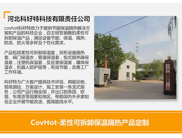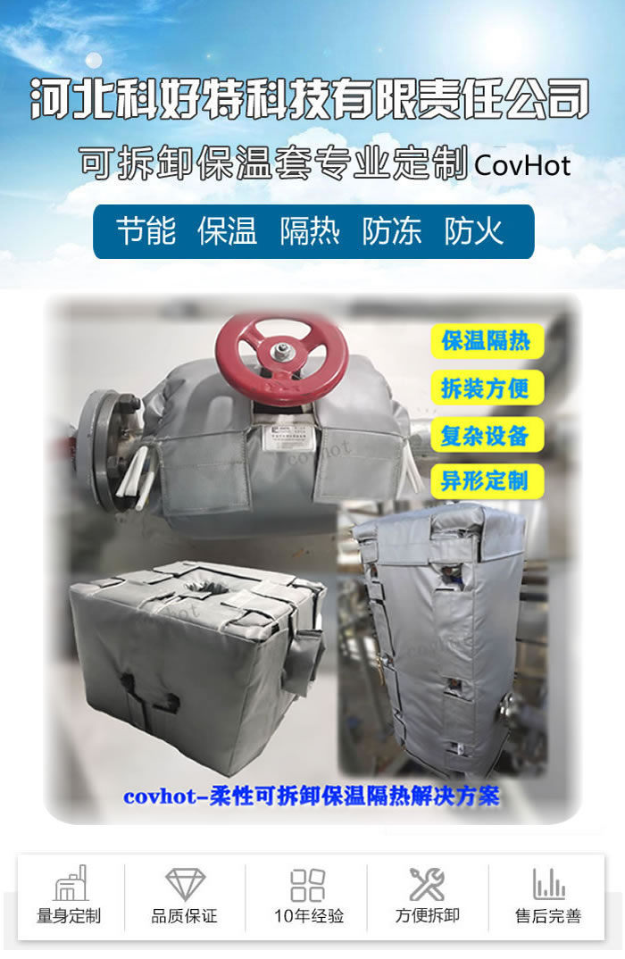 具體產(chǎn)品包括:國標(biāo)閘閥保溫套、截止閥保溫套、蝶閥保溫套、柱塞閥保溫套、球閥保溫套,過濾器保溫套,疏水器保溫套,呼吸閥保溫套,等不同類型的閥門保溫套和法蘭保溫套,彎頭保溫套,三通保溫套、管道保溫套等。確保為所有客戶帶來高品質(zhì)和高附加值產(chǎn)品,有效節(jié)約工廠電能,改善工廠工作環(huán)境。